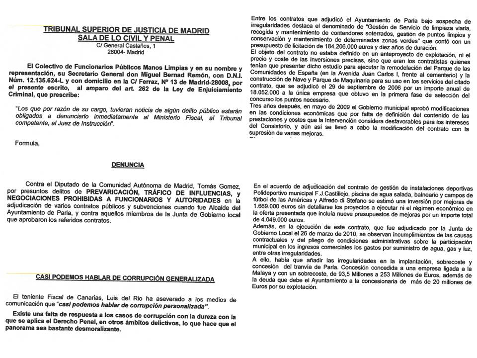 Así que en noviembre de 2006 el servicio es adjudicado a la empresa Sufí (Grupo Sacyr) por un importe anual de 18 millones de euros. Esta adjudicación y su gestión posterior es puesta en tela de juicio por el Informe de la Cámara de Cuentas de 2012, en el que se dicen barbaridades como que el contrato generó una deuda de 80 millones de euros para el consistorio. El Ayuntamiento sólo abonó 12 de las 59 mensualidades que esta empresa facturó durante los casi cinco años que estuvo prestando el servicio esta empresa. El señor Gómez Franco dejó 17 meses pendientes de abono en la fecha que dejó la alcaldía, en octubre de 2008, y lo que es más grave aún, ni siquiera incluyó en el presupuesto municipal el pago del servicio durante el ejercicio 2007. ¿Todas estas irregularidades tampoco le corresponden a él? Pues no piensan lo mismo la Cámara de Cuentas ni el sindicato Manos Limpias, que a raíz de este informe interpuso una denuncia contra Tomás Gómez en mayo de 2013. He seleccionado partes de esa denuncia, que se apoya en su mayor parte en el demoledor Informe de la Cámara de Cuentas de 2012, que analiza los ejercicios anteriores a 2010: