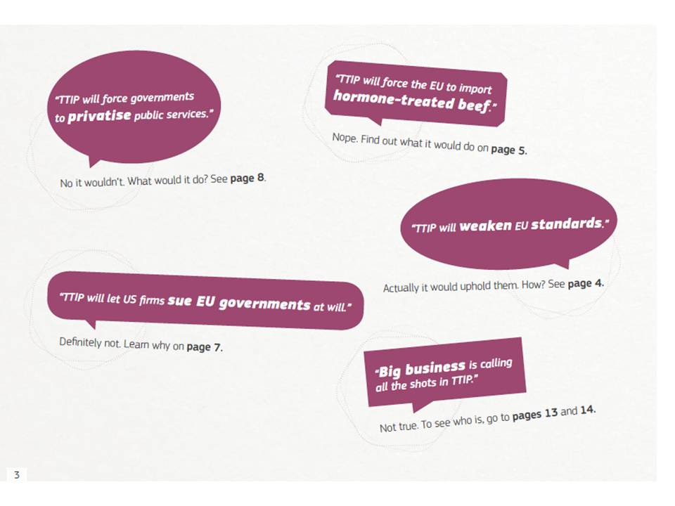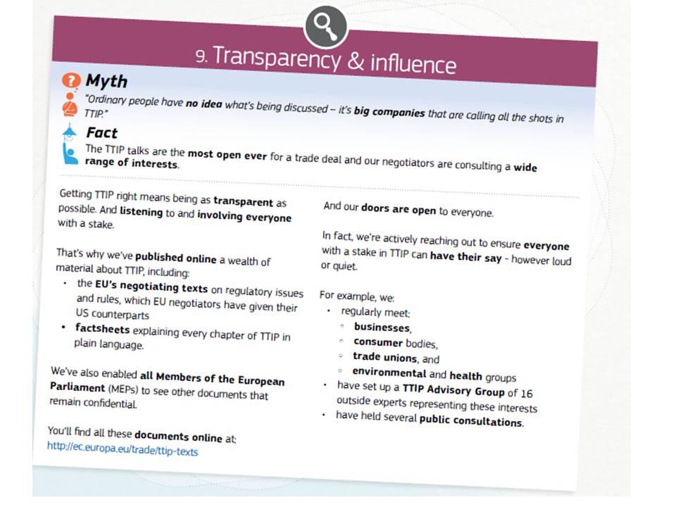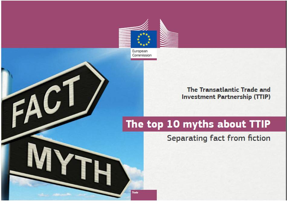 La estrategia de comunicación de la Unión Europea ha cambiado por completo después de las filtraciones. Al menos en apariencia. La web de la Unión Europea tiene ahora exceso de información respecto a este asunto, aunque supongo que filtrada. Intenta tranquilizarnos con documentos como «El top-ten de mitos sobre el TTIP», en formato presentación de Power Point, para que los incautos de los ciudadanos podamos entenderlo y tranquilizarnos.
