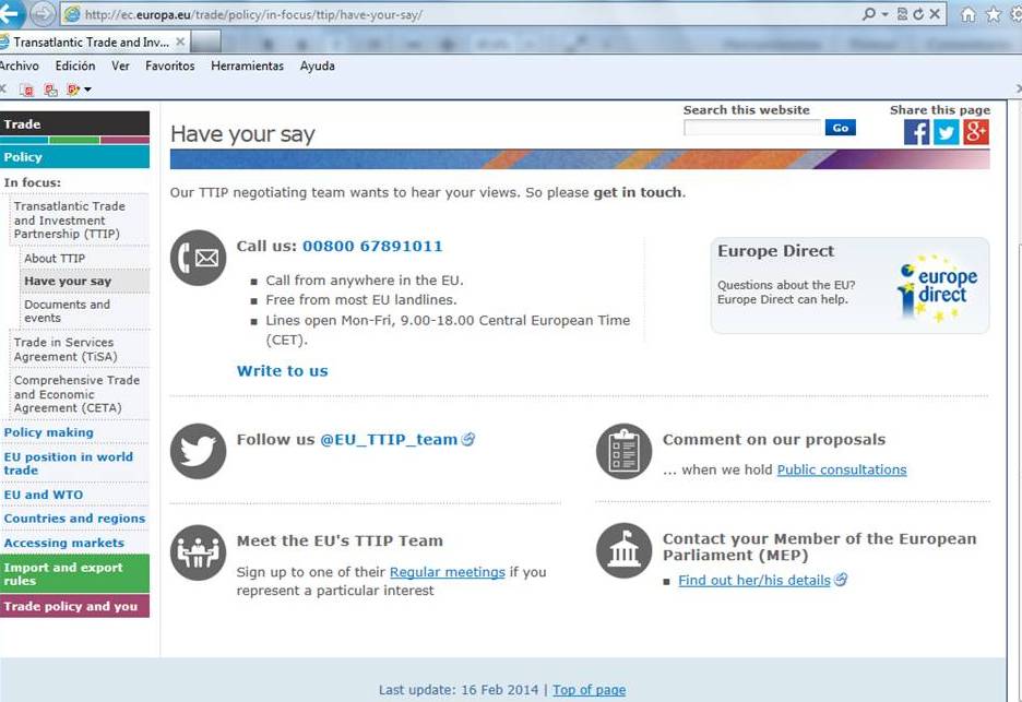 En la web puedes encontrar incluso vías de comunicación directa para transmitir tus dudas o inquietudes ante el susodicho TTIP: