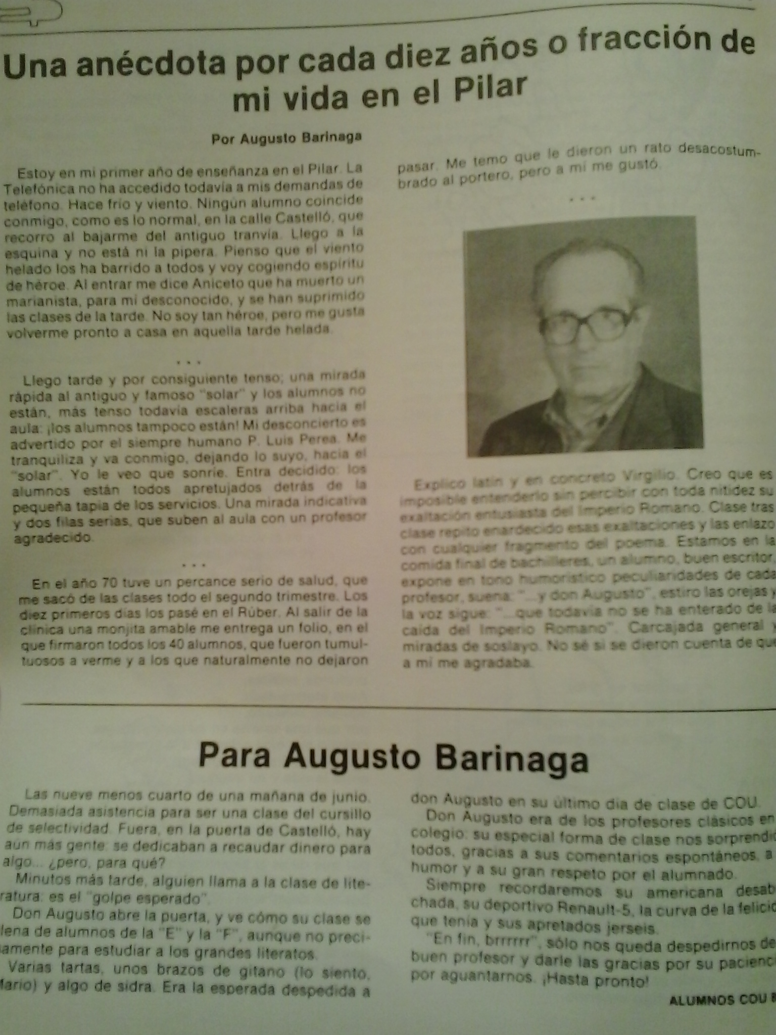 El programa podía haber destacado la condecoración que la Asociación de Antiguos Alumnos ha dado este año a ese insigne prohombre de la derecha y heredero del franquismo que es… Alfredo Pérez-Rubalcaba. Ah, no, que no interesaba, que se salía de la línea del programa. Esta condecoración supuso varios encendidos debates entre los alumnos, unas mil cartas a la asociación, e incluso un artículo de Alfonso Ussía en La Razón. En él destacaba la buena ortografía de las misivas y el empeño por su correcto uso al que nos acostumbró el profesor Augusto Barinaga, el mismo que tuve yo en ese año de 1988, el de su jubilación. La revista Soy Pilarista, que han dirigido periodistas de tan variado espectro ideológico como Juan Luis Cebrián o Luis María Anson, le dedicó en mi año este artículo que adjunto.