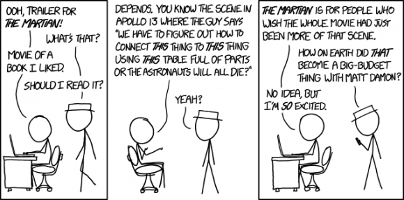 Problema, solución, problema, solución, y todo ello en Marte. Ese es básicamente el argumento, un náufrago del espacio que debe sobrevivir en un territorio hostil como el planeta rojo. Mark Watney (Matt Damon) y su lucha por conseguir alimentos, agua, comunicarse con la Tierra, y sobre todo, no volverse loco. Esta viñeta de xkcd (Randall Munroe) resume de modo fantástico la trama de la película:
