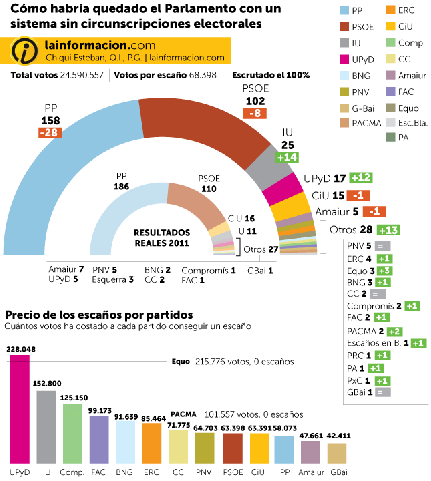 Y por supuesto un sistema proporcional y proporcionado, no como el absurdo actual en el que UPyD conseguía 5 diputados con 1,14 millones de votos y Amaiur lograba 7 con poco más de 300.000. Absurdo, surrealista. En un Parlamento nacional, los votos de los radicales independentistas valían cinco veces más que los de un partido que defendía la unidad territorial y la eliminación de desigualdades entre comunidades.