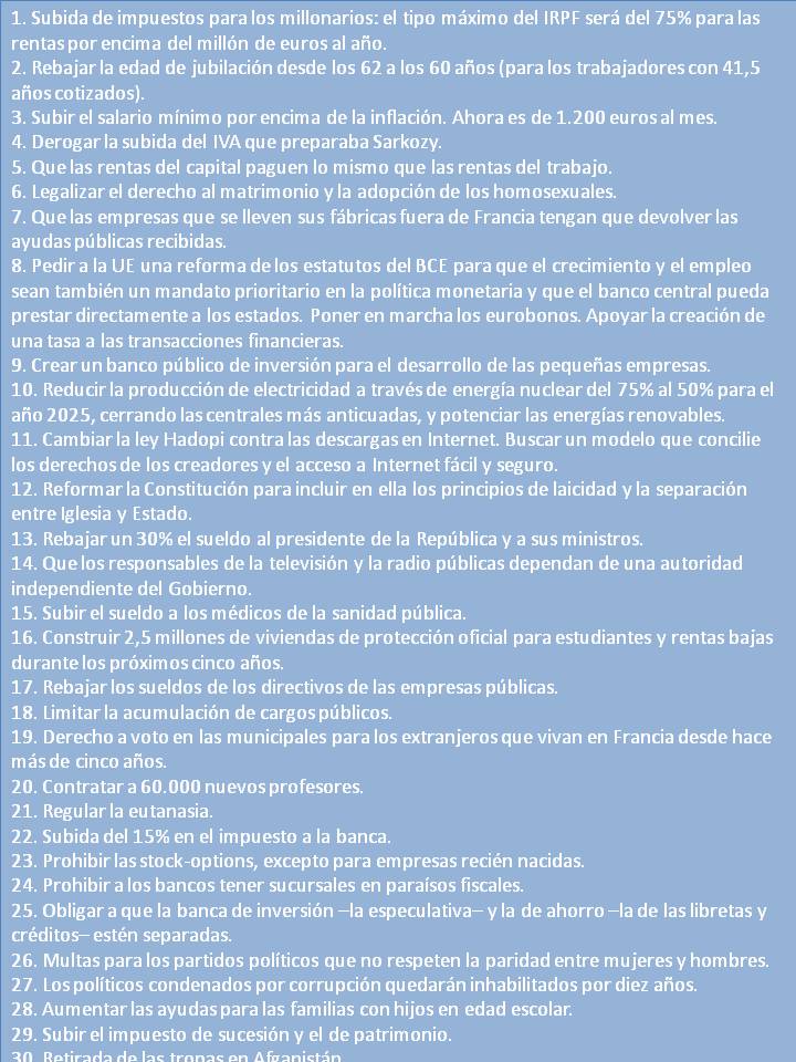 Pero Grecia no es un caso aislado, aunque sí un país con el que la troika se ha cebado especialmente a modo de aviso para navegantes. Françoise Hollande ganó las elecciones en Francia en 2012 con un programa que leído en perspectiva, tres años y medio después, nos puede provocar estupor. Transcribo aquí las líneas básicas del programa electoral con el que Hollande ganó las elecciones (extraídas del blog de Ignacio Escolar):