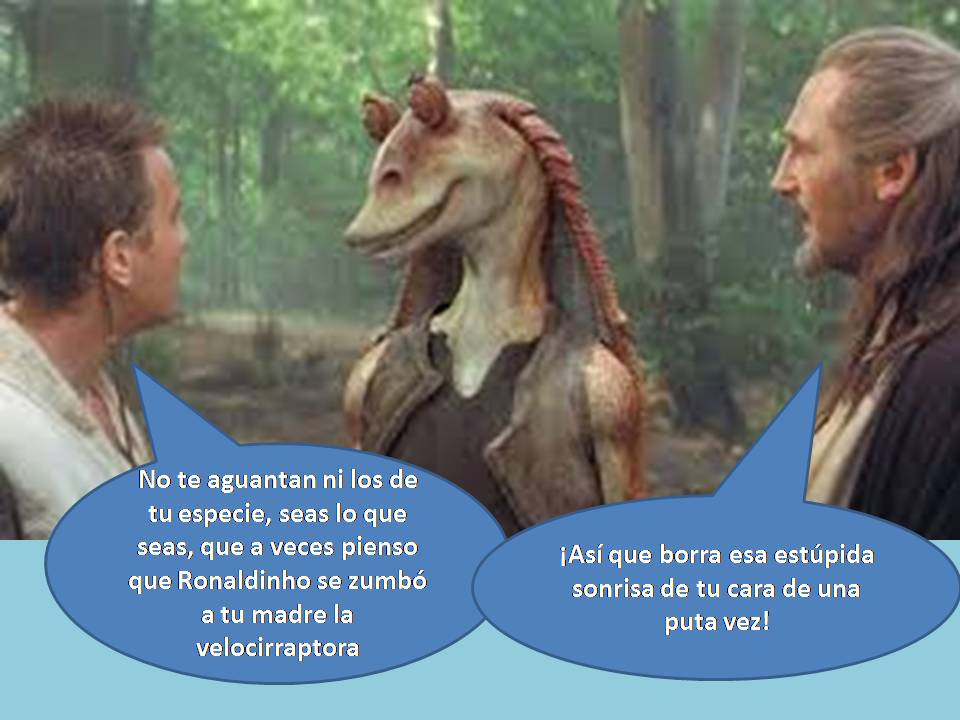 Y por supuesto, el denostadísimo y con razón Jar-Jar Binks. Se han dicho tantas cosas negativas sobre él que no quiero insistir demasiado. Todos los gungans son un despropósito, hablan como futbolistas brasileños en días posteriores a una fiesta de cumpleaños. George Lucas reaccionó a las críticas de los espectadores y lo hizo desaparecer casi por completo en las siguientes entregas. Algunos internautas se le adelantaron y editaron una versión de La amenaza fantasma suprimiendo digitalmente a este personaje, y los que la han visto dicen que mejora considerablemente la versión de Lucas. Este personaje es uno de esos guiños de Lucas para arrancar una sonrisa fácil a los más jóvenes de la sala, pero creo que solo logra el cabreo de los adultos.