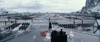 El Líder Supremo Snoke (Andy Serkis) parece un holograma de un orco sacado de El Hobbit. Pero el que me parece detestable desde el primer minuto es ese general nazi pelirrojo llamado Hux. Realiza un discurso penoso a las tropas con una voz de niño repelente del cole, que más que miedo provoca ganas de soltarle una patada en la boca. La escenografía recuerda de modo no disimulado a Núremberg y el nazismo.