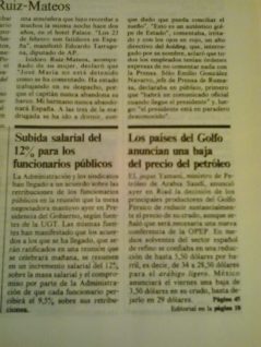 He querido dejar la noticia que figura a la izquierda de la referida al precio del petróleo y la OPEP porque hay cosas que sí cambian: hoy en día resultaría imposible encontrar una subida similar. Es cierto que la inflación de entonces no tenía nada que ver con la actual, pero ¡un 12%! Yo creo que hay funcionarios con largas carreras que no acumulan ese incremento ni en un par de décadas.