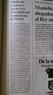 Para no mezclar intereses públicos con privados, encuentro una noticia del 10 de junio de 1982 que hace referencia a la creación de un Registro de Intereses del Ayuntamiento de Madrid que persigue eso tan de moda que es «la mayor transparencia en la actuación municipal«, palabra con la que a muchos se les llena la boca y luego se comportan de modo totalmente opaco, con cuentas en Suiza, mentiras, sociedades en Panamá, mentiras, etc,… Poco hemos avanzado en esta materia. Por cierto, según la noticia, a la moción se opuso un concejal de UCD, un tal José María Álvarez del Manzano (¿a que os suena?), que luego sería alcalde de Madrid con el Partido Popular.