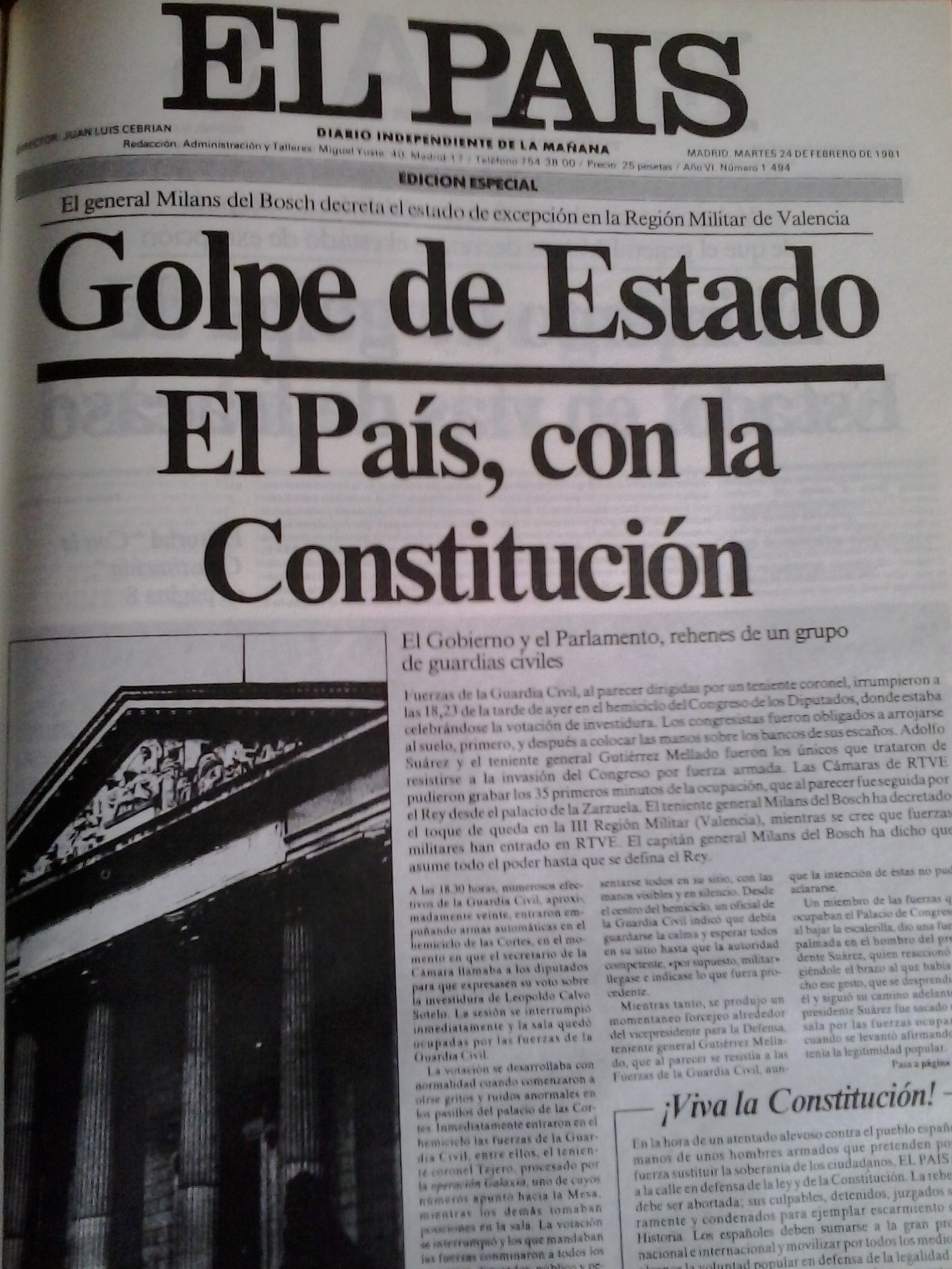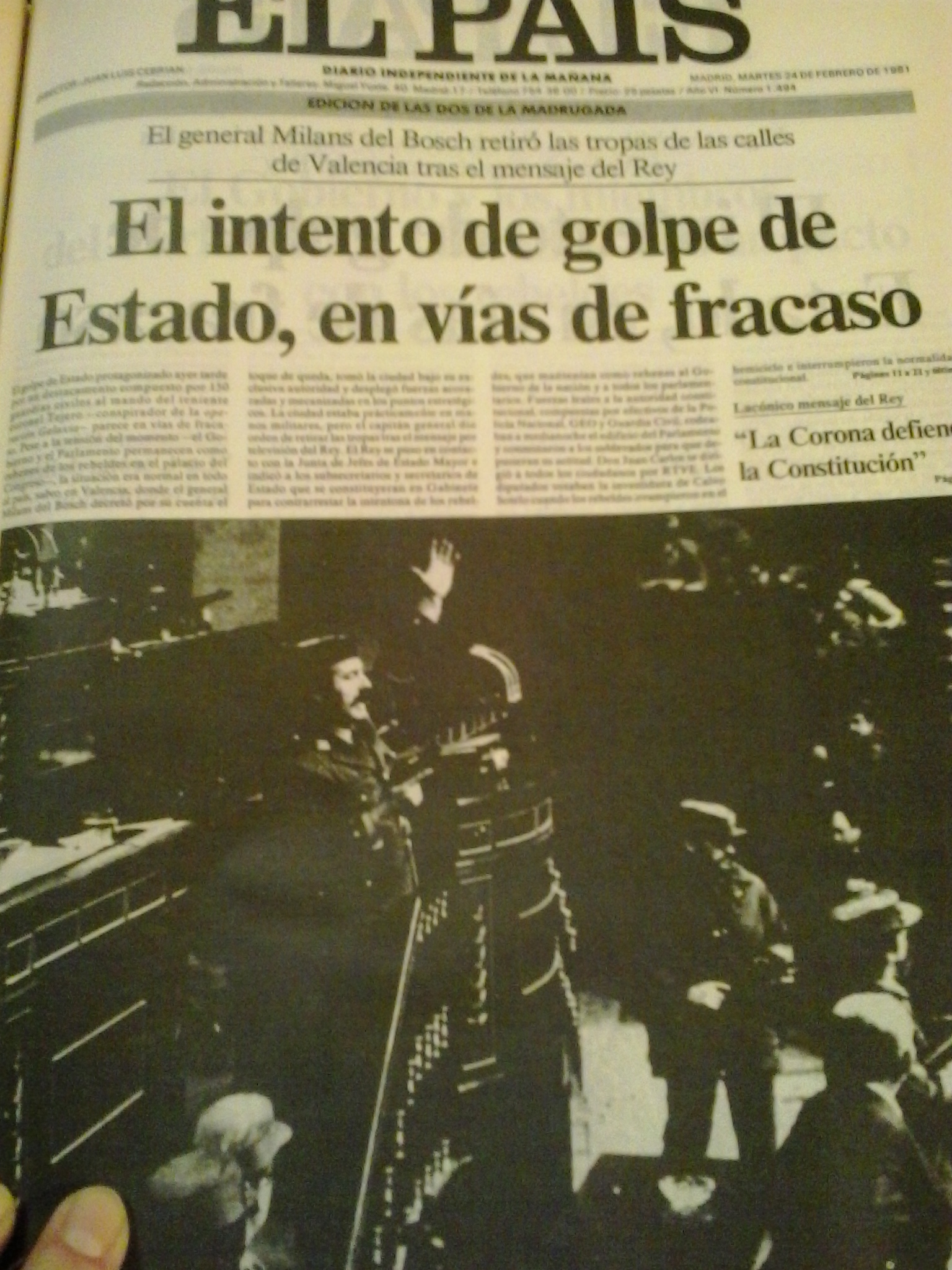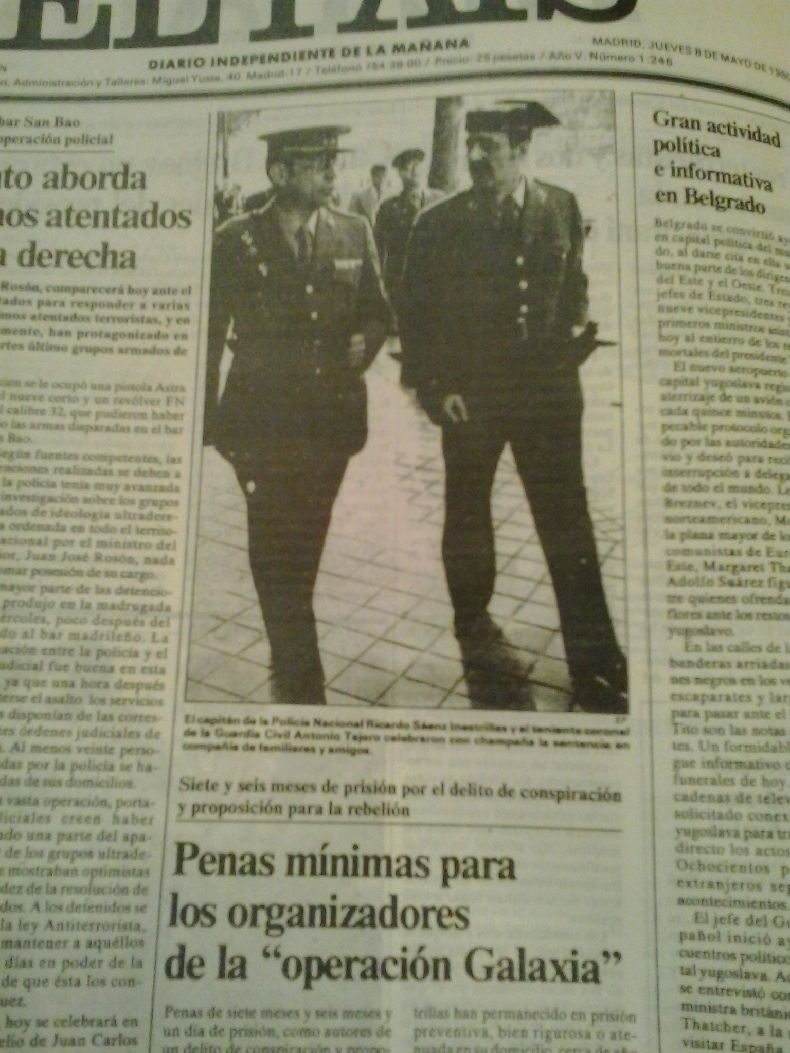 Evidentemente el día del golpe, con mis diez añitos, no tenía ni idea de quién era ese señor del mostacho que se dirigía al Congreso pistola en mano con los famosos «¡Quieto todo el mundo!» y «¡se sienten, coño!», pero resulta que el 8 de mayo de 1980, así como el 5 de julio del mismo año, es decir, apenas siete meses antes del golpe, el mismo teniente coronel de la Guardia Civil Antonio Tejero había sido portada del periódico (junto al capitán de Infantería Ricardo Sáenz de Inestrillas) por la condena tras su implicación en la «Operación Galaxia», acusados de «conspiración y proposición para la rebelión«.