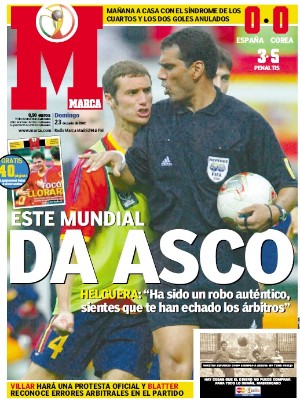 Aparte de los dos goles anulados, hay dos detalles menos recordados, pero que demuestran que el equipo arbitral tenía instrucciones claras. Una es la última del partido, un córner a favor de España que ni siquiera nos dejó sacar. Y la otra fue cuando apenas quedaban 3 ó 4 minutos de prórroga, en un pase de Morientes a Luis Enrique que lo dejó solo frente al portero. No le dejaron seguir, ¡pitaron fuera de juego, España no tenía derecho ni a acercarse!