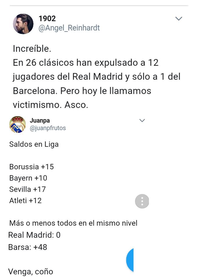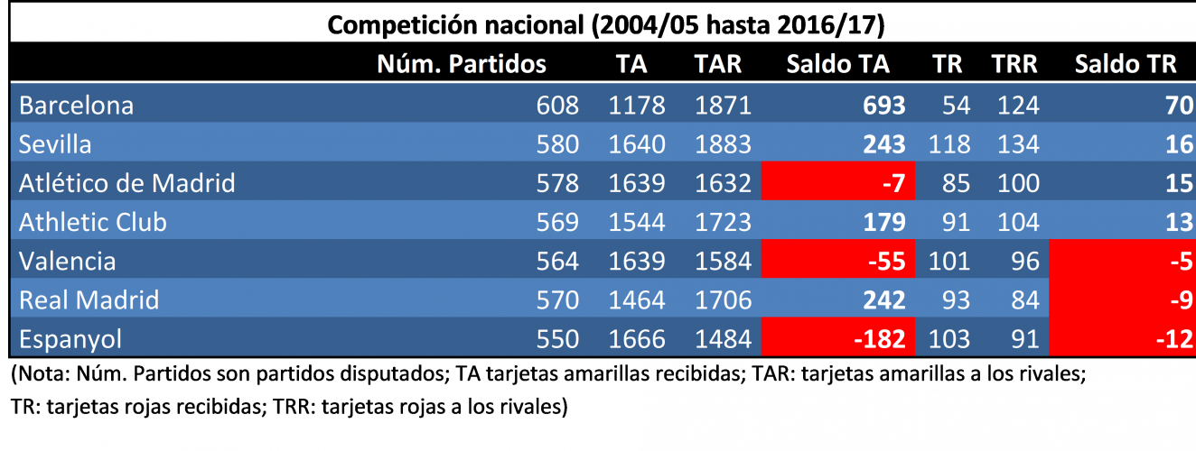 Que el Madrid, siendo un equipo dominante y ofensivo, tenga un saldo negativo entre tarjetas rojas propias y rivales (-9) es un insulto a la inteligencia del aficionado. Y ya la comparación resulta obscena cuando compruebas que el saldo del Barça en ese apartado es de +70. Que la comparación con el Atleti también sea claramente desfavorable debería llevar a algún periodista a analizar cómo es posible ese hecho cuando los colchoneros tienen 500 faltas más que los madridistas (y ya no hablo de la dureza).
