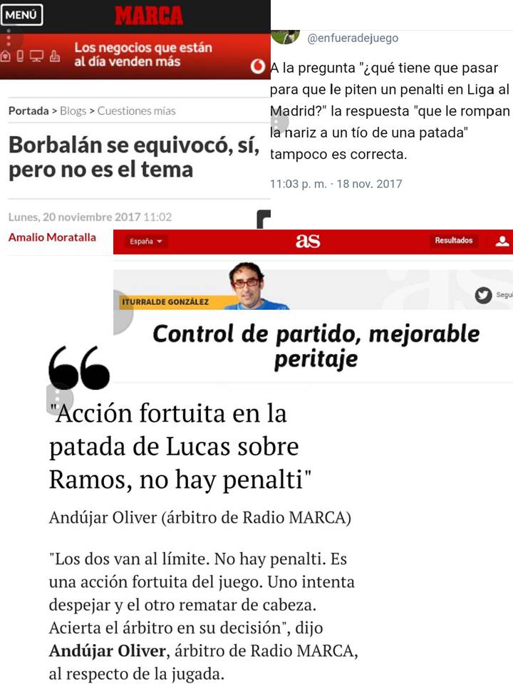 Las diferencias de criterio son enormes en ocasiones. Todos vimos el patadón de Lucas a Sergio Ramos en el derby, que acabó con este sustituido y la nariz reventada. Pues bien, ni siquiera en los medios otrora madridistas tenían clara la influencia del árbitro en el resultado del partido. Para Andújar Oliver (Marca) no hubo nada. Para Iturralde (¡As!), Borbalán no estuvo mal, aunque podía haber estado mejor. Vamos, que influyó en el resultado, pero que tampoco es para tanto. Los peores árbitros copan los medios de comunicación.