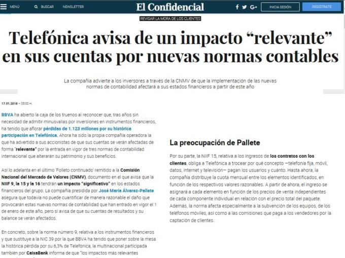 La persona de a pie, quizás cuando lea la noticia de Telefónica de que las modificaciones en la NIIF 15 “tendrían un impacto significativo en los estados financieros en la aplicación inicial”, esa persona de calle pensará «a mí me cobran lo mismo (incluso me suben 5€ la cuota), por lo que los ingresos serán mayores…». Explícale a esa persona o al pequeño inversor que tiene acciones de Telefónica desde que cobró su primer sueldo, que ahora los contratos se deben de contabilizar en función de si es móvil, fijo o adsl y con independencia de si es un paquete o no, y que eso afecta de modo considerable a los resultados de la compañía. No lo entiendo ni yo.