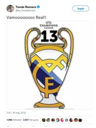 Por cierto, ahora dicen que Karius tenía conmoción cerebral por culpa de un choque con Ramos. Supongo que cualquier cosa vale para echar mierda sobre la victoria, pero si es verdad entonces es otro punto en contra del árbitro y sus ayudantes. Son ellos quienes tiene que parar el juego porque un portero no esté en condiciones de jugar.