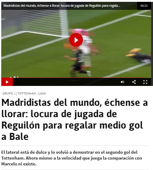 El «tonito» ya es de deshueve hacia los «madridistas del mundo, échense a llorar». La realidad es que es una muy buena jugada del lateral madrileño, que se la cede a Lamela, quien a su vez abre para Bale y el centro de este termina desviado a gol por un defensa del Lask, un equipo austriaco de la Europa League. Ni pase directo, ni medio gol, ni leches. Pero lo que se busca es resaltar el error del Madrid y de su entrenador, como se ve en el primer párrafo: «ahora mismo a la velocidad que juega la comparación con Marcelo ni existe». A mí me encanta Sergio Reguilón, del mismo modo que durante años Marcelo me ha parecido el mejor lateral izquierdo del mundo, pero el club ha apostado por Mendy y Marcelo, y cuenta con un lateral muy prometedor llamado Miguel Gutiérrez, que está a punto de dar el salto. Pero, sobre todo, el Madrid ha vendido a Reguilón porque necesita los ingresos (que nadie olvide la crisis económica por la pandemia) para no acabar como el Barça. Todo eso da igual, para la prensa el Madrid erró con su salida. En este artículo reciente que publiqué para La Galerna mencioné más de una veintena de titulares en la misma línea sobre los exmadridistas por el mundo.