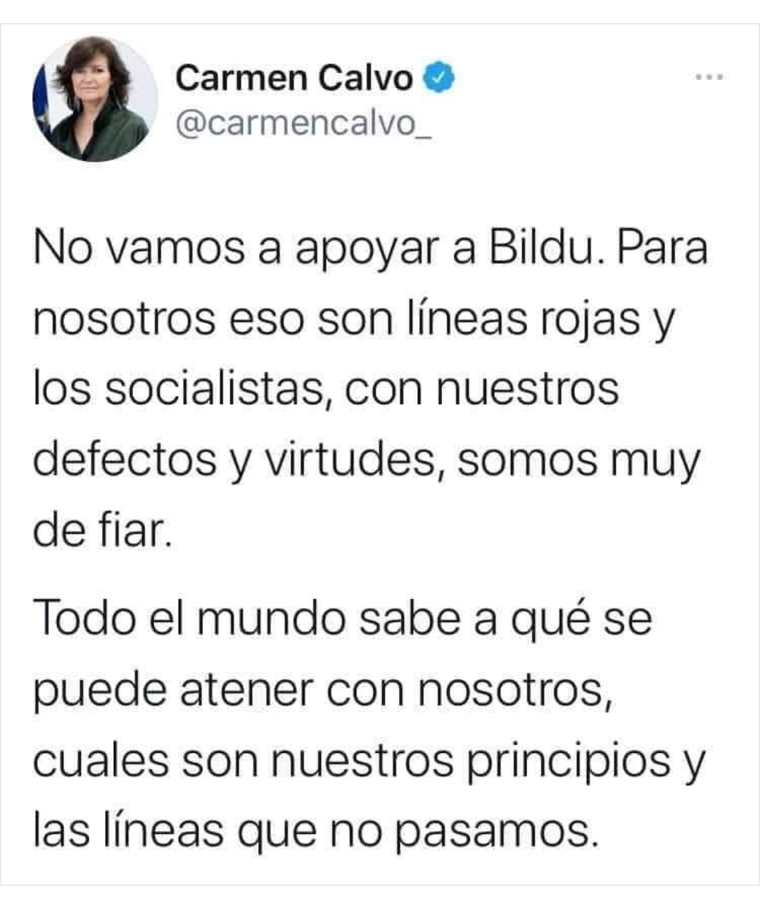 Sí se podía pactar con Bildu, pese a que escuchamos en innumerables ocasiones que «con Bildu no se acuerda nada» (junio de 2019), o que «no me voy a reunir con Bildu», «ni siquiera para decirles que no» (febrero de 2016), porque estaba claro que «con Bildu no vamos a pactar, si quiere se lo digo cinco veces o veinte durante la entrevista» (abril de 2015).