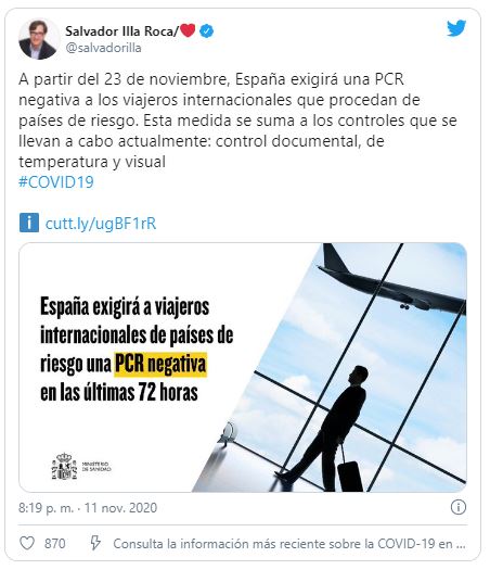 No se podía, pero ahora ya sí se puede exigir una PCR negativa a los viajeros que lleguen de países de riesgo, como venían haciendo Italia y Francia, sin ir más lejos. La medida entrará en vigor a partir del 23 de noviembre, pese a que durante muchos meses se desestimó la implantación de esta medida, y aun hoy sigue haciéndolo el coordinador de emergencias, Fernando Simón.