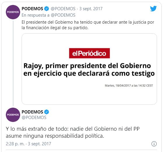 No se podía mantener a un imputado o investigado en el partido, no digamos a un condenado, pero ahora ya sí se puede. Recordemos que los líderes de Podemos dijeron hasta la saciedad que no era admisible que un partido tuviera miembros imputados en sus filas, o que no se asumieran responsabilidades políticas en una investigación por financiación irregular. Esta misma semana, el 20 de noviembre, la cúpula de Podemos acudirá a declarar por financiación irregular.