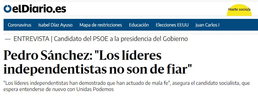 Pues sí, resulta que no se podía, pero ahora ya sí se puede pactar con Bildu e incluso blanquearlos, como llevan haciendo desde hace unos meses, y de modo especialmente vergonzoso esta última semana. Pero es que ¡también se podía pactar con Esquerra Republicana de Cataluña!, pese a que Pedro Sánchez dijera hasta la saciedad que no iba a pactar los presupuestos con los independentistas por la oposición de los militantes del partido y, entre otras cosas, porque «los líderes independentistas no son de fiar».