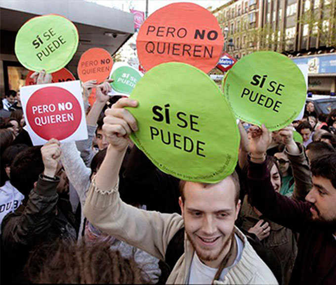 «Sí se puede» fue un eslogan popularizado por la Plataforma de Afectados por la Hipoteca, una forma de decir que había alternativas para los ciudadanos, que sí se podía paralizar un desahucio en los años duros de la terrible crisis del ladrillo que terminó en crisis de deuda. El partido de Pablo Iglesias se adueñó en sus inicios del eslogan, tres palabras que además encajaban a la perfección con el nombre escogido para el partido, Podemos, un lema que sus seguidores proclamaban en sus mítines y manifestaciones públicas.