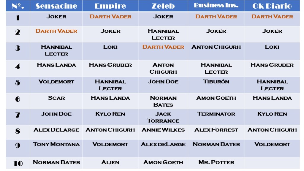 Si gugleas «los mejores villanos de la historia del cine» o «los personajes más malvados», casi siempre aparece Darth Vader en el número 1, junto a una serie de villanos con los que coincido (Hans Landa, Hannibal Lecter, el Joker) y otros bastante discutibles. ¿Qué pintan Tiburón o Alien en esta lista, o una criatura como Terminator que no es otra cosa que un exterminador? ¿Qué edades tienen esos votantes que ponen a Loki o Voldemort en el top-10? Tendré que hacer mi propio listado, por lo que veo. Ya tengo tarea para otro post.