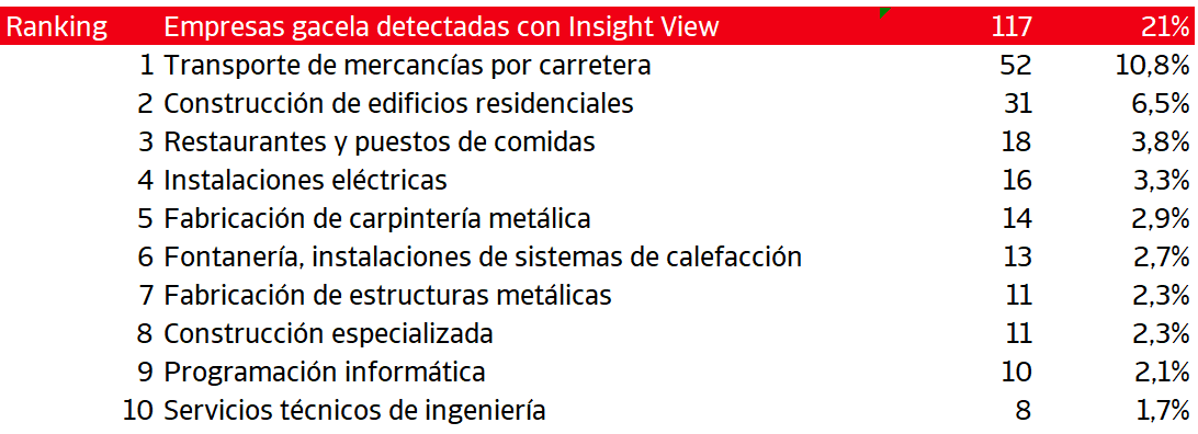Para el que no esté familiarizado con el término, se llama empresas gacela a aquellas empresas de crecimiento rápido, constante y muy por encima de la media. Según la OCDE, son empresas que logran crecimientos superiores al 20 por ciento durante tres años consecutivos. Suelen tener una plantilla reducida, buenas cifras de crecimiento en facturación y empleo, y una rentabilidad por encima del 15 por ciento. Según la web 123emprende, en España había unas 30.000 empresas gacela a principios de este año, localizadas fundamentalmente en Madrid y Cataluña. El sector de mayor crecimiento de este tipo de empresas en Europa es el de las tecnologías de la información, según el ranking Europe’s 500 seguido del inmobiliario y la construcción. Los sectores en España son, según el estudio de Iberinform, Crédito y Caución, los siguientes: