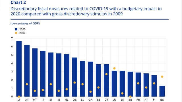 Los estímulos fiscales directos nos sitúan a la cola de Europa en cuanto al impacto presupuestario que suponen, según un informe reciente del Banco Central Europeo: