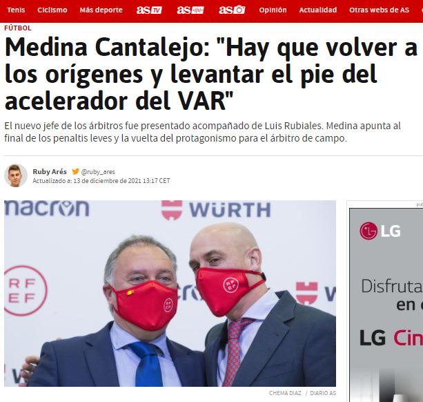 Ahora llega el sevillano Medina Cantalejo y a mí me recorre un escalofrío por el cuerpo. Hay que darle un tiempo, por supuesto, pero para los que tenemos memoria, pertenece a ese grupo de colegiados nefastos y lo que es peor, protagonistas y con ademanes chulescos. De momento, una de sus primeras decisiones (con la que en principio estoy de acuerdo) ha sido dejar el VAR solo para ocasiones flagrantes o errores graves y manifiestos. Eliminar su intervención en muchas de esas jugadas en las que no se ve nada y a cámara lenta se ve que los futbolistas chocan, ya sin el balón en juego, o una vez despejado el mismo, y les da por señalar penalti.