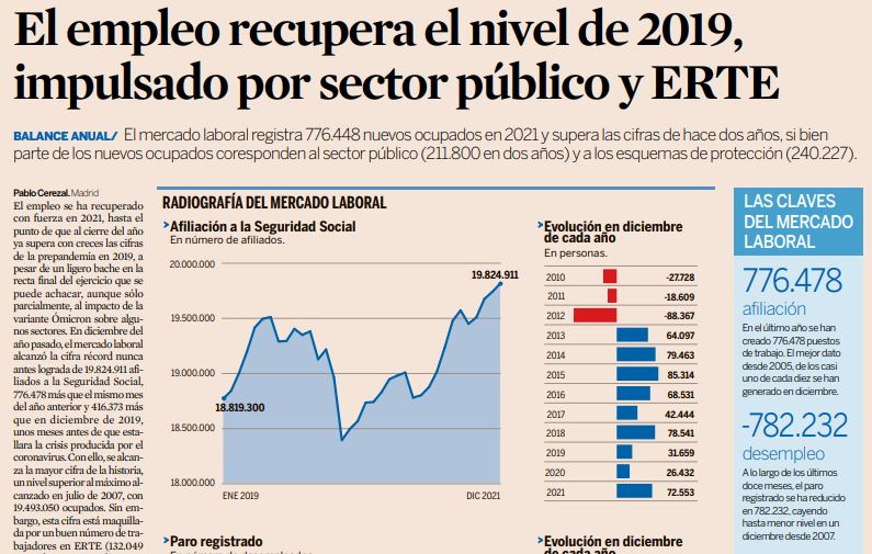 La cifra de creación de empleo «está maquillada por un buen número de trabajadores en ERTE (132.049 ocupados en promedio mensual, una cifra que parece haber dejado de reducirse, los autónomos acogidos a las prestaciones extraordinarias (108.178) y el fuerte aumento del empleo público en los dos últimos años (211.800). Si se descuentan todos estos factores, el mercado laboral del sector privado seguiría a día de hoy con 35.654 ocupados reales menos que antes de la crisis» (Fuente: Expansión).