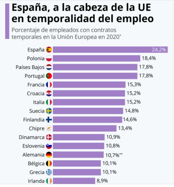La otra gran diferencia respecto a nuestros socios europeos que las sucesivas reformas no han logrado atajar es la temporalidad. Según el estudio de Statista, España destaca con mucho en el porcentaje de contratos temporales respecto al resto de la Unión Europea: