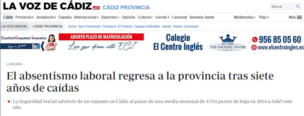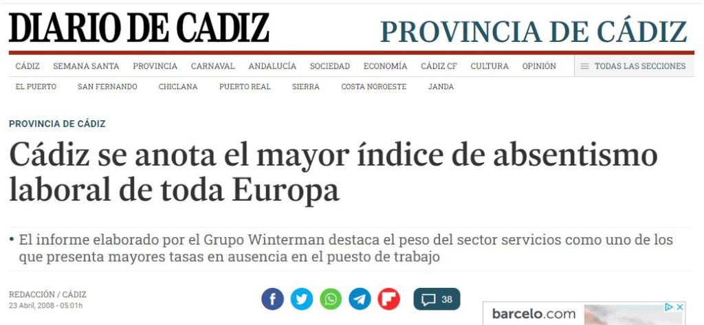 La provincia de Cádiz suele andar en los primeros lugares de absentismo laboral en España, y buscando estadísticas, encuentro que ya en 2008 era la provincia con la tasa más elevada no solo de nuestro país, sino de Europa: