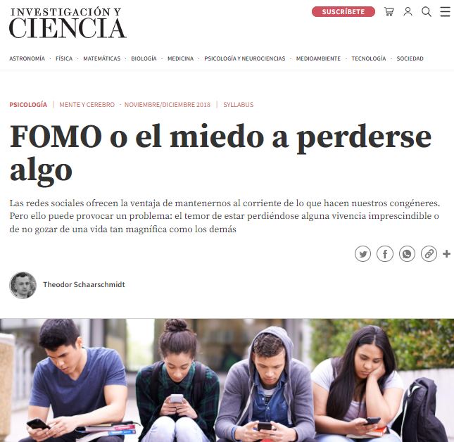 FOMO: Fear Of Missing Out. En este mundo de las redes sociales, la sobreinformación, la necesidad de reconocimiento y la sobreexposición, el síndrome del FOMO es el miedo a perderse algo, como una experiencia maravillosa que otros están disfrutando, ya sea un concierto, una fiesta o el último vídeo de moda. Pero lo preocupante del FOMO es el temor que crea sobre todo en los jóvenes a no recibir el reconocimiento por la vida que uno vive (la dictadura de los likes), o la angustia que les genera creer que no disfrutan una vida tan «plena» como la de sus amigos. El FOMO está muy relacionado con la frustración de la juventud. La aceptación o no aceptación del grupo, lo que ha pasado toda la vida, pero ahora aumentado por el uso abusivo de los móviles y las redes.