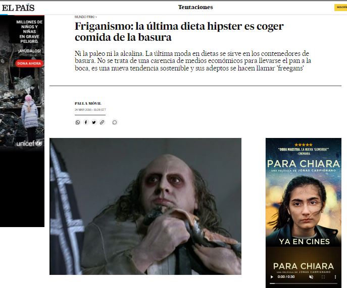 Friganismo: ¿os creíais que no existía una palabra para coger comida de la basura? Lo que toda la vida se ha llamado «pobreza» hoy tiene un nombre posmoderno. La palabra en cuestión viene del inglés freeganism, que promueve un estilo de vida anticonsumista, sano y teóricamente vegano, aunque me temo que más por necesidad que por convicción. «Lo de comer directamente de la basura, además de salvar el planeta, tiene varias ventajas». «Rebuscar en la basura no es de pobres, es de mileuristas». Cosas así se pueden encontrar en este elogio de la búsqueda del tesoro entre los desperdicios de un contenedor: dumpster dive, bucear en la basura.
