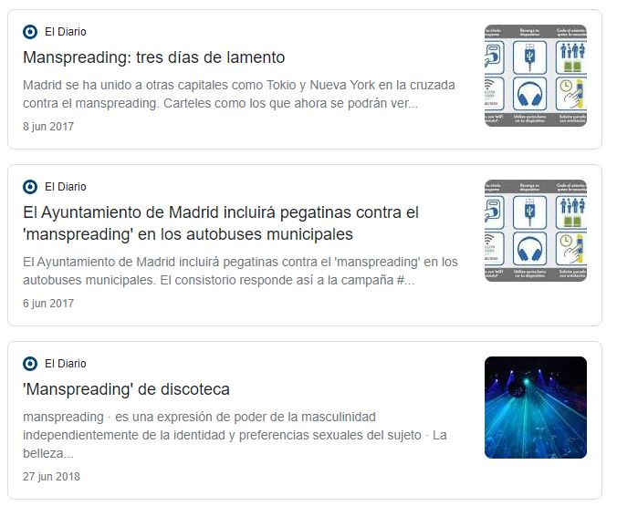 Manspreading: en una definición extraída, «es el nombre que recibe la costumbre de muchos hombres de sentarse con las piernas bien abiertas, ocupando más espacio, casi como si estuvieran marcando su territorio». Que una cosa es ir «espatarrao» en el Metro, lo cual es de muy mala educación, y otra muy diferente es montarse unas pajas mentales sobre el ansia «machirula» de mostrar la dominación del espacio, la autoafirmación de los atributos masculinos y el ofrecimiento del género a las hembras cercanas.