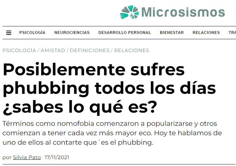 Phubbing: se llama mala educación, sin más. Consiste en usar el teléfono móvil (phone) delante de alguien que te está hablando, o en una comida o cena con más gente, lo que supone una forma de desprecio (snubbing), mala educación y falta de respeto acojonante. Se solucionaría con un bofetón a mano abierta, o mejor, llamémoslo openhanding.