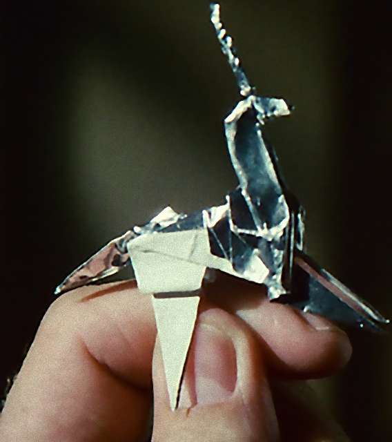 Nunca entendí la referencia, si era un plano preciosista que le apetecía rodar a Ridley Scott (metió los unicornios en Legend un par de años después) o si tenía un significado profundo. El caso es que en uno de los primeros montajes (creo que el inicial) no había más referencias al unicornio, luego podría ser una pista falsa, un arenque rojo. Sin embargo, en el llamado Director’s Cut, el personaje de Gaff (Edward James Olmos) deja un origami con forma de unicornio en el apartamento de Deckard.