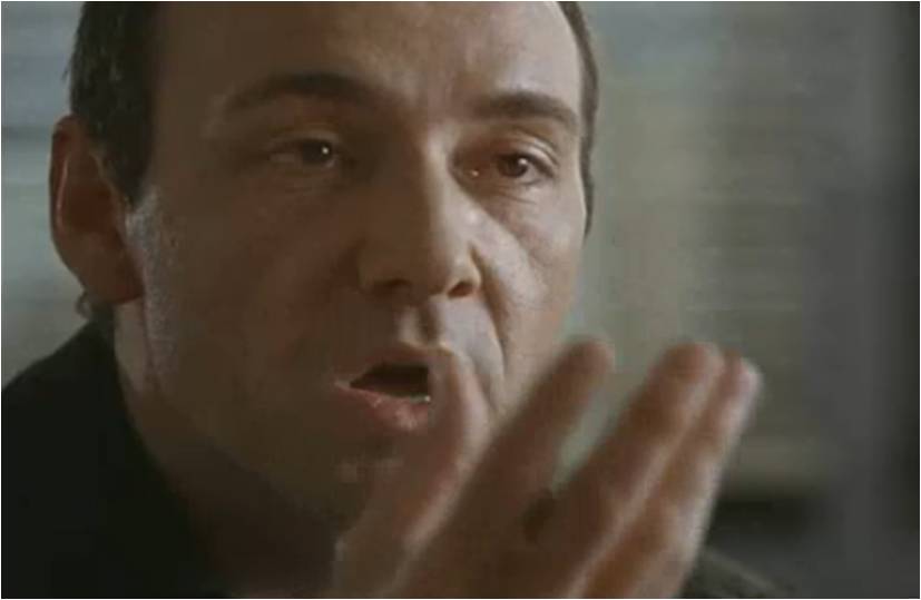 Uno de los villanos favoritos de mi lista, por cierto. Y como podremos comprobar al final del guion, casi todo en el mismo son “arenques rojos”, pistas para despistarnos: la discapacidad de Spacey, el aspecto físico del temible Keyser, o el nombre que vemos en la taza del inspector de policía: KobaYashi. No deberíamos dar nada por hecho, sino fiarnos de algunas frases que estaban en nuestras narices: “El mayor truco que hizo el diablo fue convencer al mundo de que no existía“. “Y así, (se sopla en los dedos) desaparecer”.