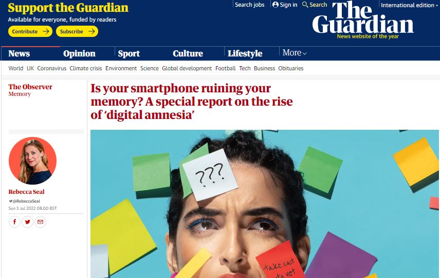 Cada vez leo con más frecuencia el término “amnesia digital”, un término referido al hecho que parece contrastado de que el cerebro pierde la capacidad de retener información en el momento en que no tiene el estímulo para hacerlo, pues siempre tendrá un aparato cerca para desempeñar esa función por él. Como se preguntaba Rebecca Seal en este interesante artículo publicado en The Guardian, Is your smartphone ruining your memory? Al “subcontratar” la memoria a un aparato externo, el modo de funcionar de nuestro cerebro se altera.