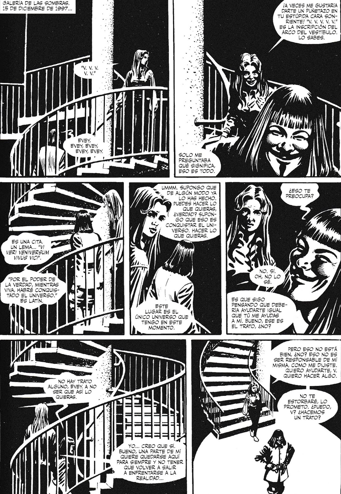 La doctora es la única persona que ve la cara de V en toda la novela. Lo conoce, sabe quién es y las aberraciones que cometieron con aquel prisionero de la celda «cinco». O «V». Hay mucho más que una venganza en la motivación del protagonista de la obra. Aunque para algunos estudiosos de la obra sea importante averiguar su identidad, y se han organizado debates sobre si hay pistas en la novela (que si es el padre de Evey, que si es la rea de la celda IV, que si es alguno de los dirigentes en el poder), lo cierto es que carece de relevancia, al menos para mí. A V lo mueve un sentido muy particular de la justicia, una vieja compañera que considera que fue vejada y a la que hay que restablecer. A su manera, claro está, lo cual sitúa al propio V en un escalón diferente del fascismo.