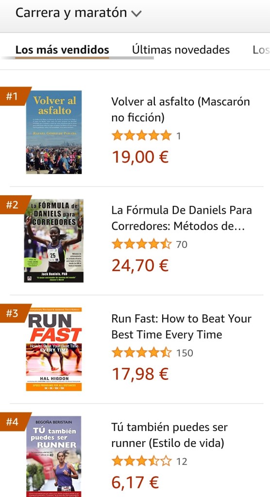 Pues no fue una broma, pero durante unos días, mi libro Volver al asfalto estuvo en el número 1 del top de Libros más vendidos de Running, maratones o como quieran llamar a este vicio de correr.