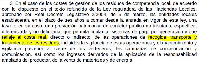El punto 3 no debería generar ningún tipo de problema, pues la Ley es clara respecto a la necesidad de que los ayuntamientos creen y establezcan un impuesto sobre la gestión de sus residuos, que incluya además la recogida selectiva en origen, el transporte a instalaciones especializadas y el depósito final. El artículo 11 indica: