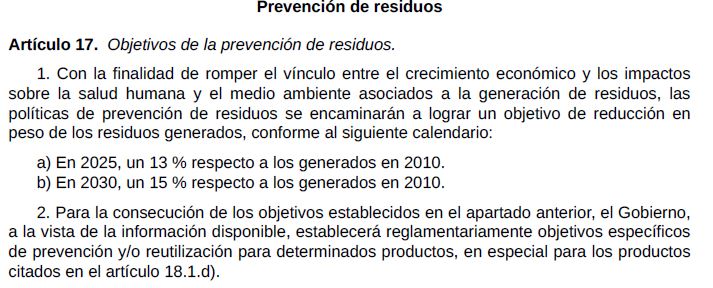 La Ley incide en varios puntos sobre la «prevención», es decir, la reducción de los residuos en origen, en los diseños de fabricación o en las cantidades producidas.