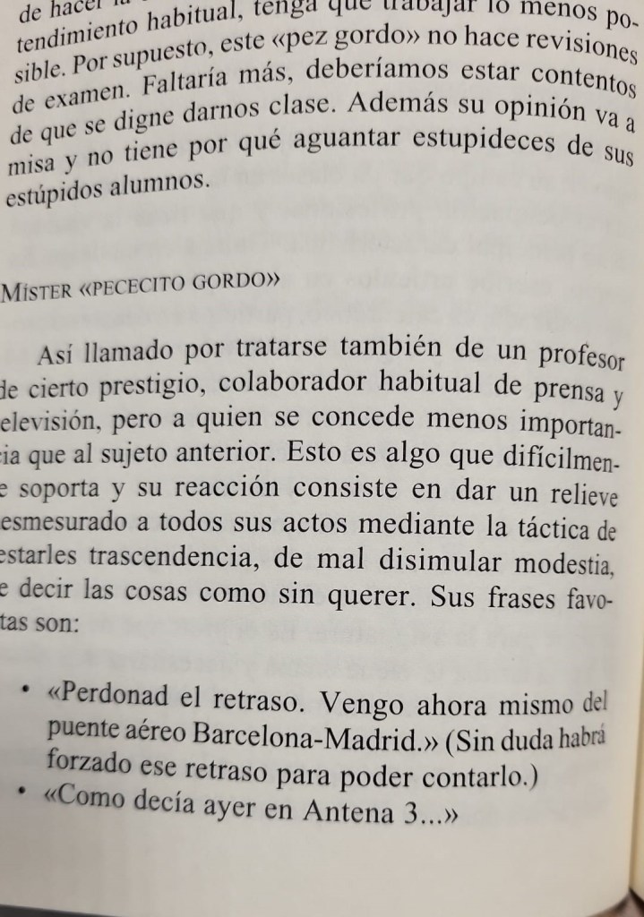 El “pez gordo” es ese sujeto de reconocido prestigio en su campo que da clases en la universidad como cuarta ocupación profesional y que tiene la vanidad como principal característica. Trabaja en un despacho propio, escribe artículos en algún periódico o revista especializada, es catedrático, participa en debates o programas de radio y alguna vez de televisión (no en La batalla de las estrellas) y está enamorado de su figura. (…)