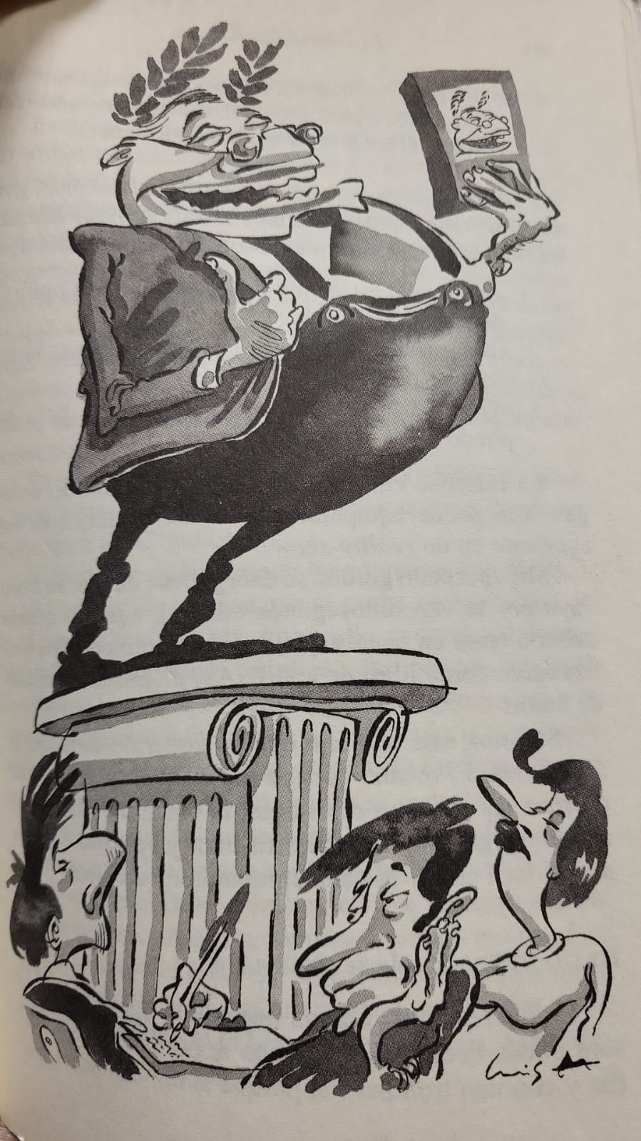 La editorial Temas de Hoy encargó al ilustrador Luis Miguel Pérez González que acompañara mis textos con una serie de dibujos y el diseño de la portada, y aunque nunca lo conocí en persona, me pareció un crack. Un fuera de serie que captó la esencia de cachondeo que había en el libro. Con Don Ramón Tamames lo clavó: