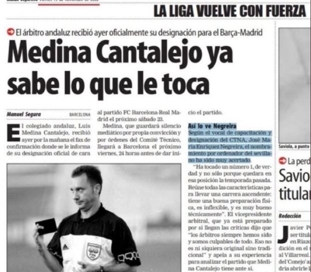 Será muy complicado demostrar que esos pagos tuvieron incidencia real en los arbitrajes, por muchas anomalías de las que ya hemos hablado sobradamente en este blog, pero aunque solo fuera por el intento de controlar el Comité Técnico de Árbitros la sanción debería ser ejemplar. El bochornoso show de Medina «Cantadelejos» el pasado jueves ya indicó por dónde van los tiros: los árbitros han sido honestos, nunca jamás se equivocaron a favor del Barça y Negreira no pintaba nada. Curioso, cuando el propio Negreira estaba en las designaciones arbitrales como la del propio Medina (para el Clásico del cochinillo, por ejemplo) o en las comisiones que decidían los ascensos y descensos. Las hemerotecas le dejan en pelotas: