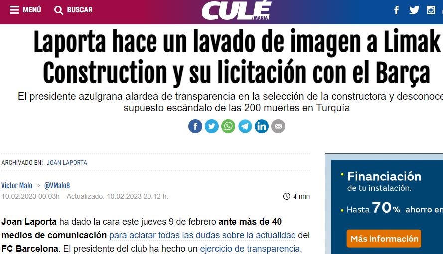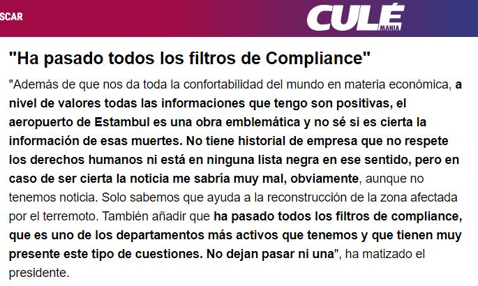Algunas noticias que he encontrado estos días hablan de Limak como una empresa perteneciente a lo que llaman «la mafia de las cinco», las cinco grandes constructoras que se reparten el pastel de las contrataciones públicas en Turquía. También tienen la sombra de la duda por su modo de trabajar y los doscientos muertos en las obras del aeropuerto de Estambul, dato que desmiente el propio Haldun Firat Köktürk. Además, los culés pueden estar tranquilos, Limak pasó la revisión jojojo de la comisión de Compliance jojojo del club, ¡juasjuasjuas!, la misma que lleva años pasando por alto todo lo que se ha visto en estos últimos años.