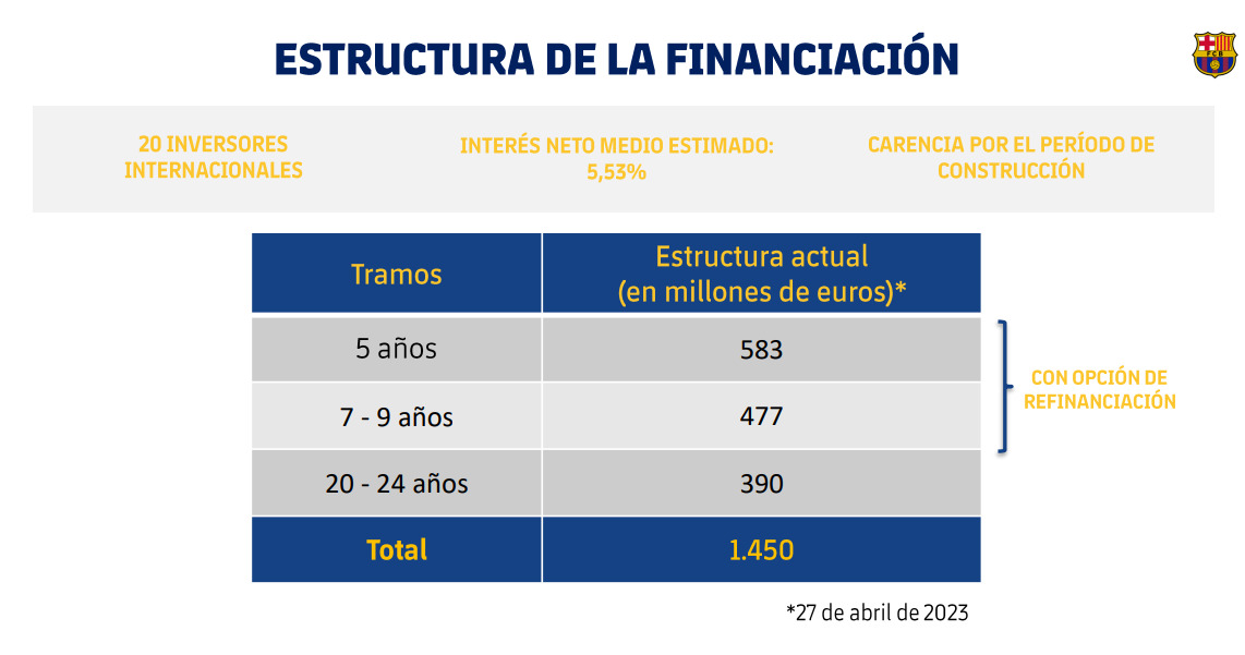 El vicepresidente económico del club, Eduard Rumeu, dejó otra cifra llamativa en la rueda de prensa: 2.820 millones de euros. Será el coste total del Espai Barça una vez abonados los intereses durante treinta años, a razón de 94 millones de euros anuales. Según los directivos del club, la financiación tendrá un coste neto del 5,53 por ciento, y destaco la palabra «neto» porque es muy posible que el coste de la operación ronde el 7% (en torno al 6% de nominal, más costes) y el tipo indicado por el club haga referencia al mismo después de descontar el 25 por ciento de impuesto de sociedades.