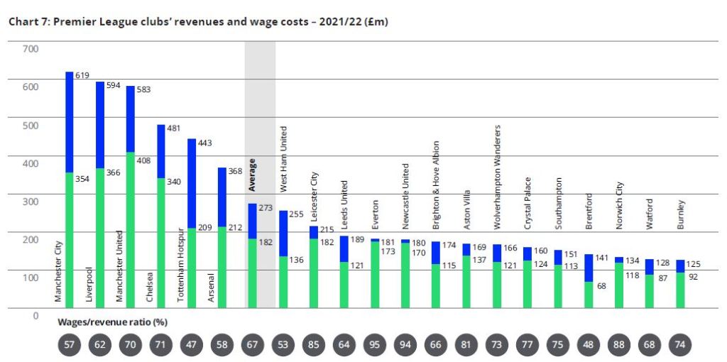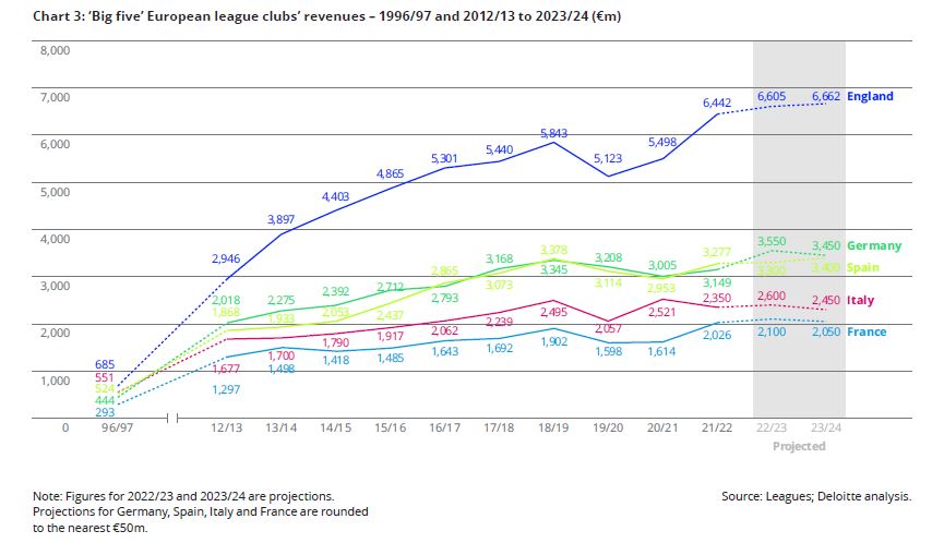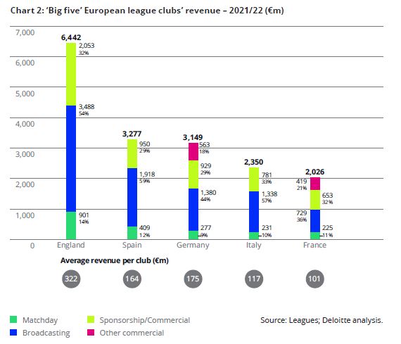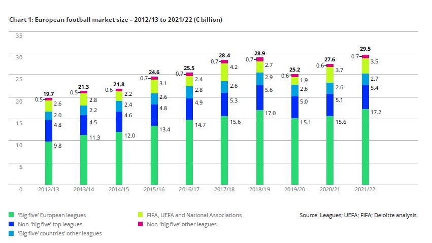 Hace dos meses se publicó el informe Annual Review of Football Finance 2023, realizado por la prestigiosa empresa de auditoría Deloitte. El Informe se basa en la temporada 2021-22, la primera post-covid, por tanto, sus comparaciones con el ejercicio anterior tienen que ser favorables por fuerza. El informe habla de la buena salud en general del fútbol, del aumento del interés entre los aficionados, de la recuperación de los datos económicos y de los balances de los clubes por la vuelta a los estadios, del incremento de los derechos de televisión,… Pero algunas cifras son cualquier cosa menos positivas, o al menos tranquilizadoras. El informe es interesante para comparar datos entre los distintos campeonatos. Se aprecia una distancia considerable y creciente entre las cinco grandes ligas y el resto de las competiciones europeas: