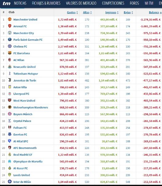 Por cierto, para los que me hablen de los fichajes del Madrid, del dineral invertido, etc., les dejo este cuadro de Maketo Lari (@maketolari) sobre el saldo neto en fichajes (compras menos traspasos) desde 2013. El Real Madrid no está en el top-20: