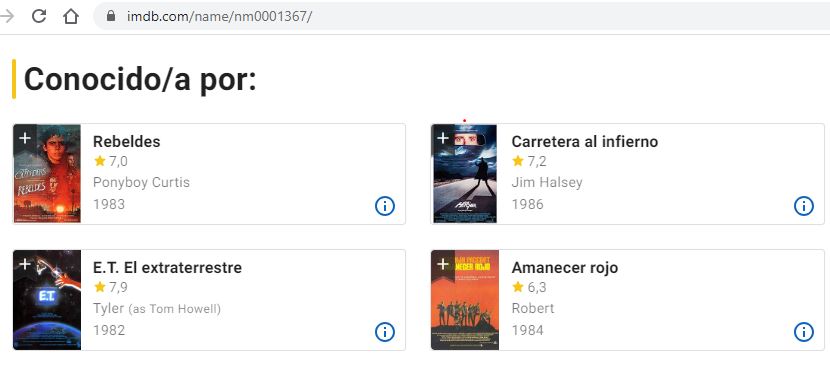 Su nombre es C. Thomas Howell, el tercero por la izquierda en la foto superior, un californiano nacido en 1966 que parecía apuntar alto. Sus primeros papeles en cine fueron ni más ni menos que con Steven Spielberg (un papel menor en E.T.) y con el mencionado Coppola. Tras Rebeldes tuvo algunos papeles que le ayudaron a mantener su estatus de estrella juvenil (Admiradora secreta y Amanecer rojo, entre los pocos que recuerdo), y tras la acongojante Carretera al infierno (The hitcher) en 1986, con un cabrón psicópata terriblemente cabrón psicópata interpretado por Rutger Hauer, le perdí la pista.