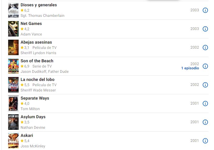 El caso es que si reviso su filmografía, compruebo que en la mayoría tomó el mismo título que aparece en la foto precedente, The wrong path, el camino equivocado. Hay papeles secundarios en The amazing Spiderman y Justice League, y algunas participaciones en episodios de Hawaii 5.0., Castle y The walking dead. Y mucho título que apesta a serie B cutre zarrapastrosa: